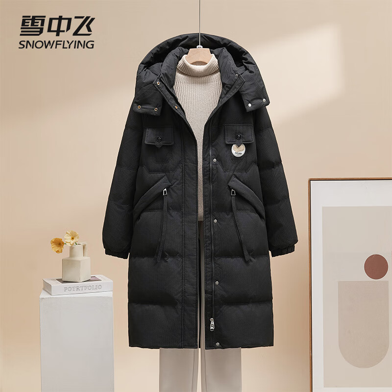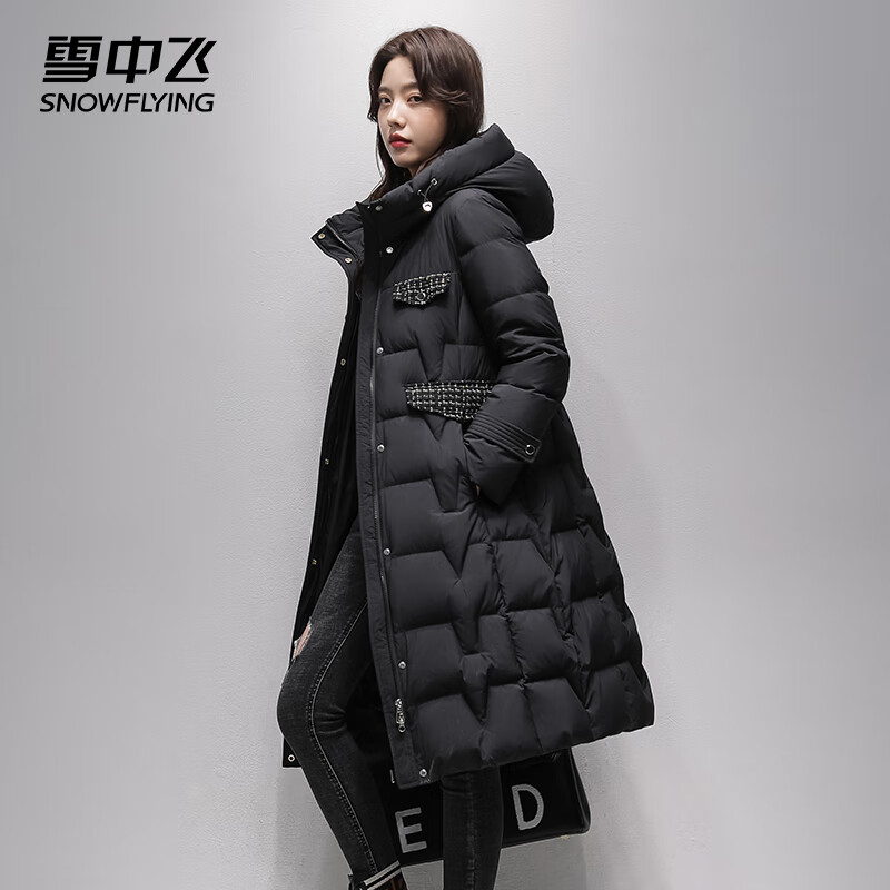 雪中飞女士长款羽绒服90鸭绒抗寒保暖时尚户外连帽外套30781 黑色 M (165/88A)