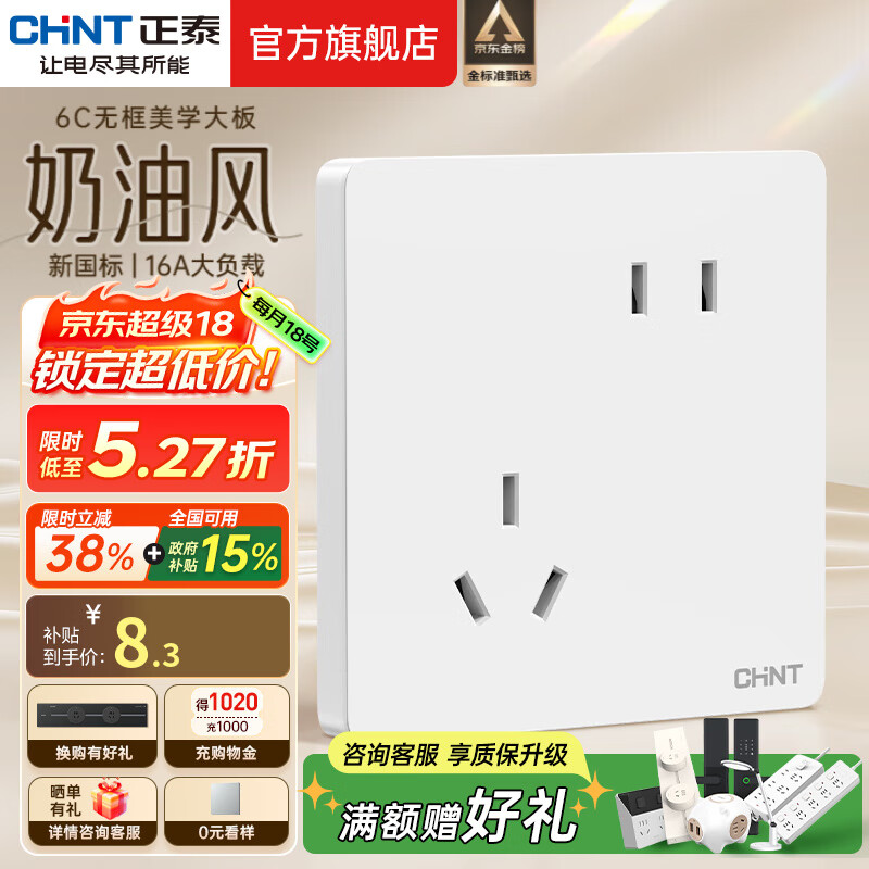 正泰(CHNT)开关插座6C奶油风 家用86型斜五孔插座面板暗装插座纯平大板 白色 斜五孔10A