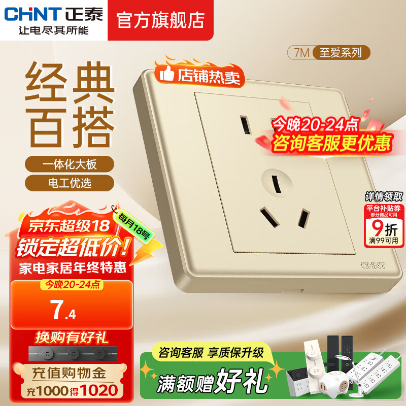 正泰(CHNT)开关插座 家用86型五孔墙壁面板暗装电源插座 电工推荐7M 香槟 五孔10A