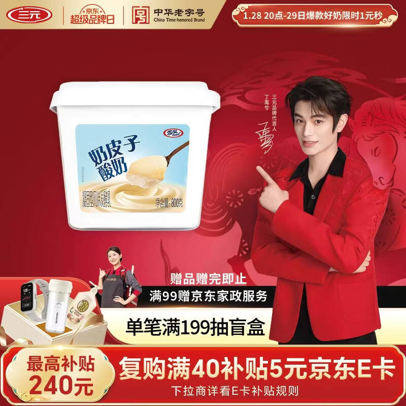 三元雪凝 奶皮子风味发酵乳原味老酸奶 800g/盒 方桶酸奶