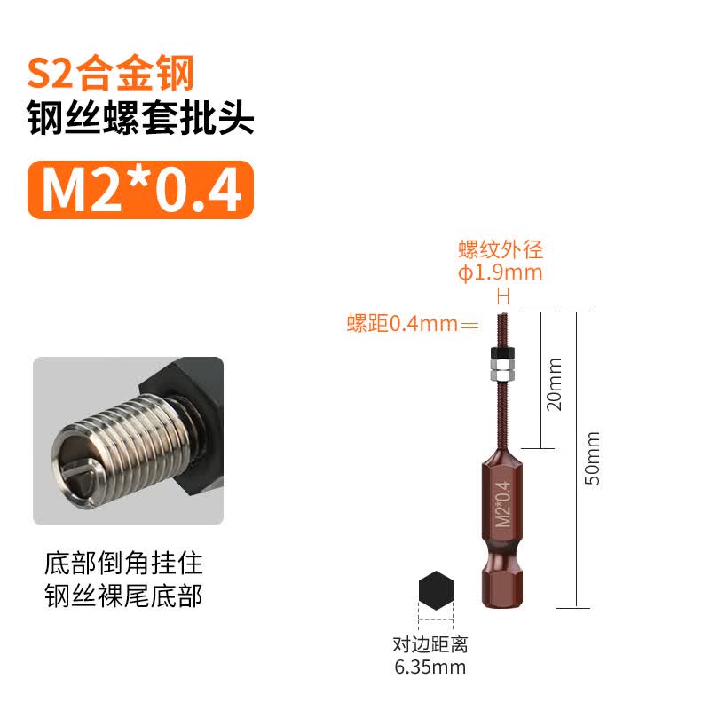 擎威钢丝螺套安装工具电动螺丝刀牙套批头M2-M12调速自动反转退出电批 M2*0.4螺套批头【单支】