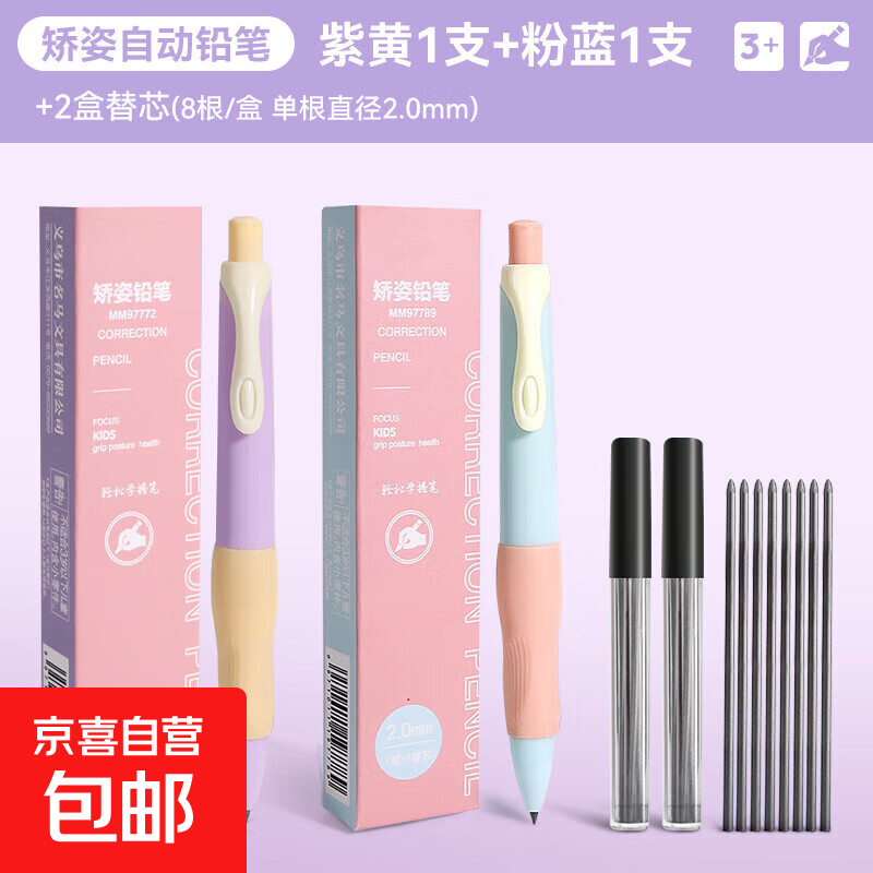 正姿自动铅笔 2.0mm小学生无毒一二三年级洞洞高颜值幼儿园专用hb自动笔儿童按动活动粗自动铅笔 【2支装】紫黄+粉蓝/含16支芯