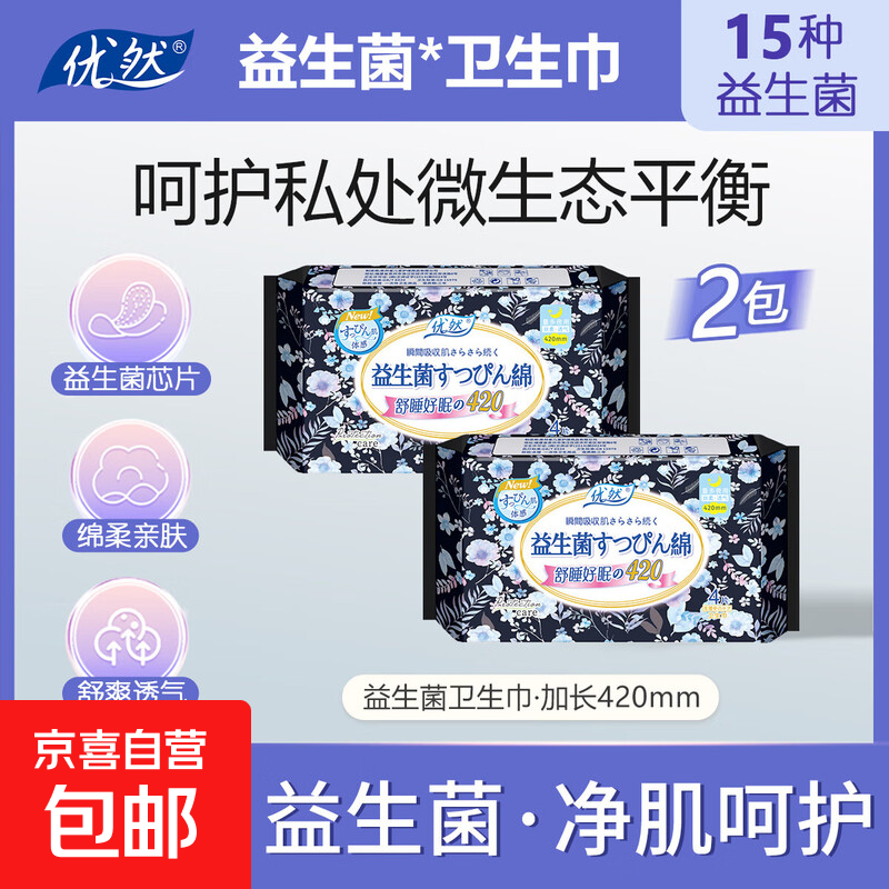 【益生菌 医护级】优然420mm夜用加长卫生巾棉柔超薄干爽透气亲肤 棉柔 420mm 8片 2包【益生菌】