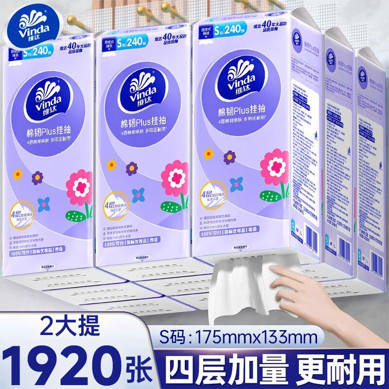 维达(Vinda)抽纸 棉韧PLUS挂抽 4层加厚悬挂式纸巾 餐巾纸家用卫生纸 960张*2提【到手1920张】
