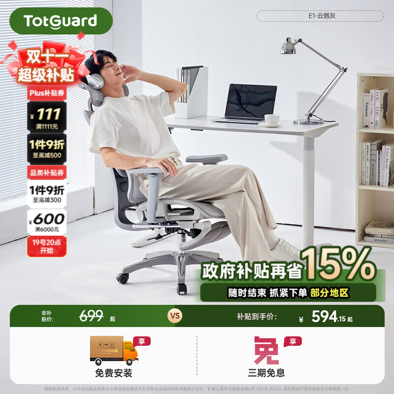 TotguardE1人体工学椅办公椅电脑椅子可升降转椅座椅久坐不累电竞椅学习椅 E1-云烟灰