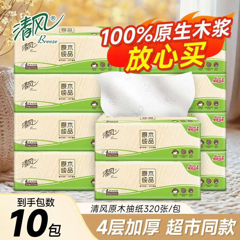清风抽纸原木纯品系列4层加厚320张软抽家用卫生纸整箱批发餐巾纸 4层 320张*10包