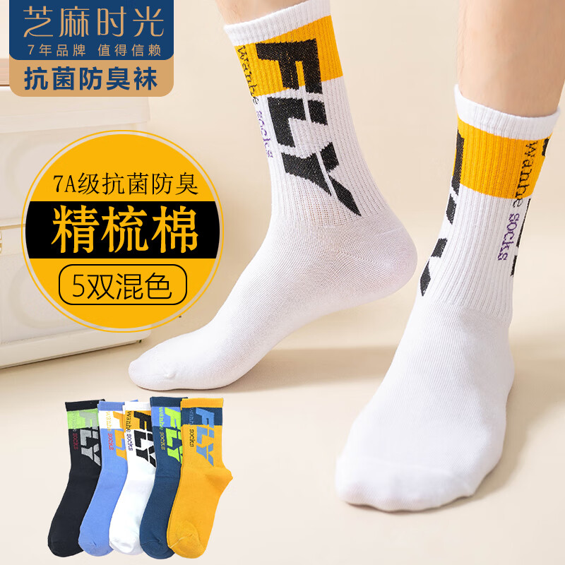 芝麻时光7A抗菌防臭 运动袜潮流袜子男袜篮球精梳棉中长筒四季均码38-46码 拍1发5【混色】F包含赠送共发 5双 均码 38-46码