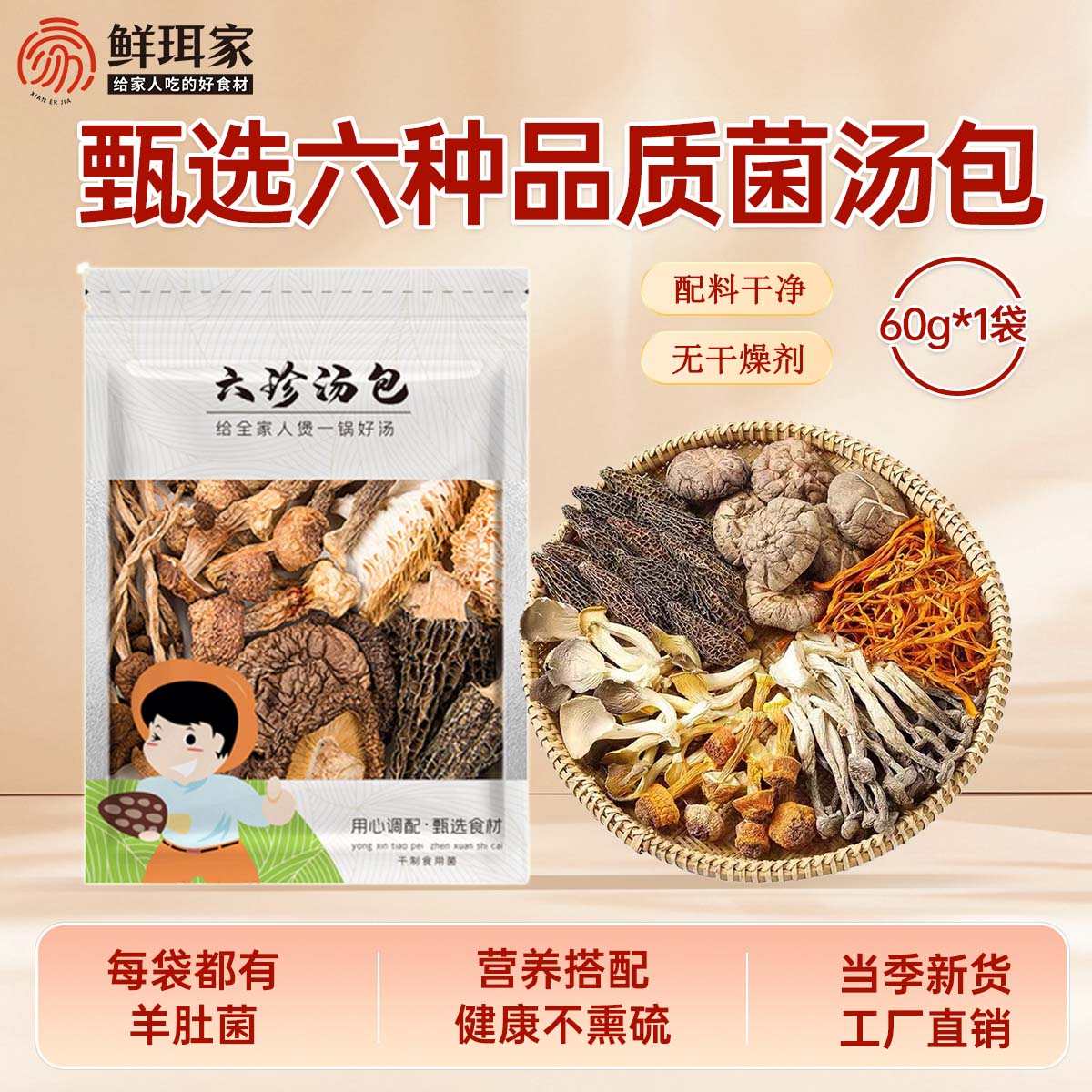 鲜珥家六珍菌菇汤料包干货特产七彩菌汤包羊肚菌松茸干货煲汤食材炖鸡汤 六珍菌汤包60g*1袋