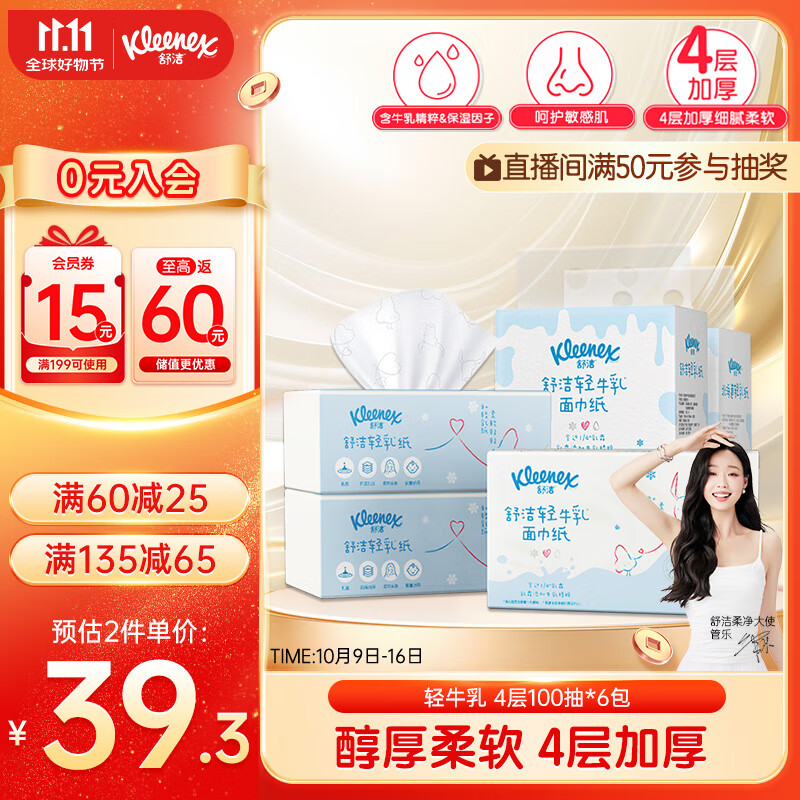 舒洁(Kleenex)轻牛乳纸抽4层100抽*6包乳霜纸保湿纸婴儿云柔巾鼻炎敏感肌可用