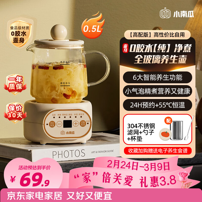 小南瓜养生壶全玻璃保温一体全自动恒温炖煮办公室小型一人煮茶壶迷你女士花茶养生烧水壶0胶水多功能壶 顶配款【配滤网+杯垫+勺子】 0.5L