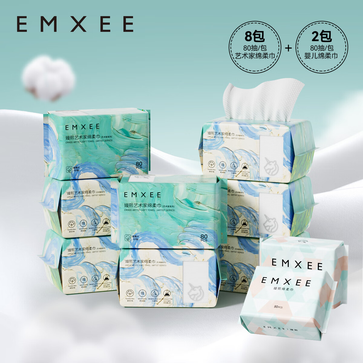 嫚熙(EMXEE)艺术家绵柔巾婴儿可用一次性洗脸巾干湿两用宝宝手口可用 80抽 8包 【赠2包婴儿绵柔巾】