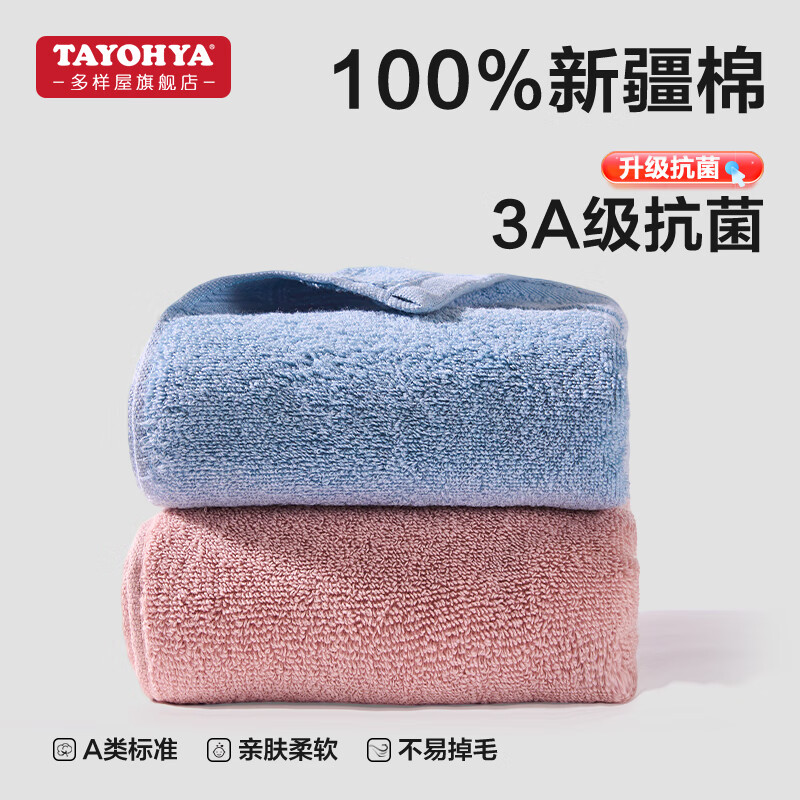 多样屋(TAYOHYA)3A抗菌毛巾纯棉洗脸巾不易掉毛全棉A类加厚洗澡巾100%棉吸水 加厚丨3A抗菌【蓝+粉】 2条