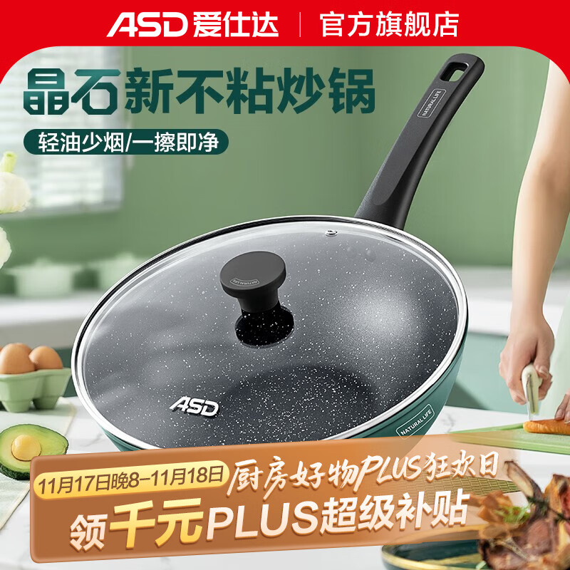 爱仕达(ASD) 不粘锅炒锅牛油果绿家用炒菜锅加深平底煎炒锅 电磁炉燃气灶通用 煎炒锅+硅胶铲 28cm