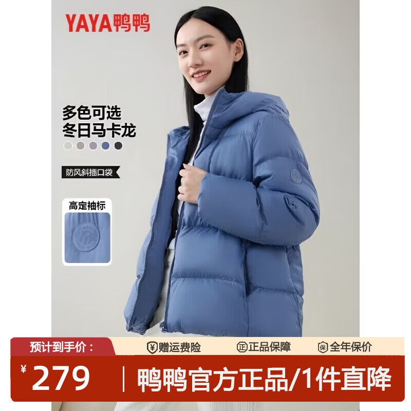 鸭鸭(YAYA)短款羽绒服女冬季新款面包宽松连帽时尚简约休闲百搭保暖外套 冰川蓝色 M 105-120斤