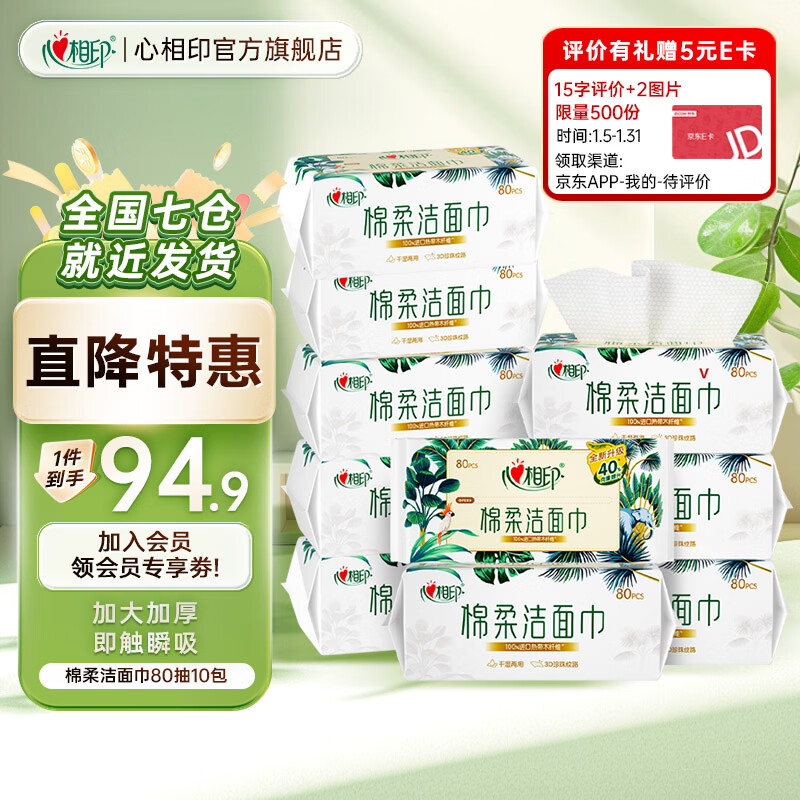 心相印洗脸巾一次性干湿两用纸巾亲肤棉柔洁面巾擦脸巾加大加厚 80抽10包【囤货装】