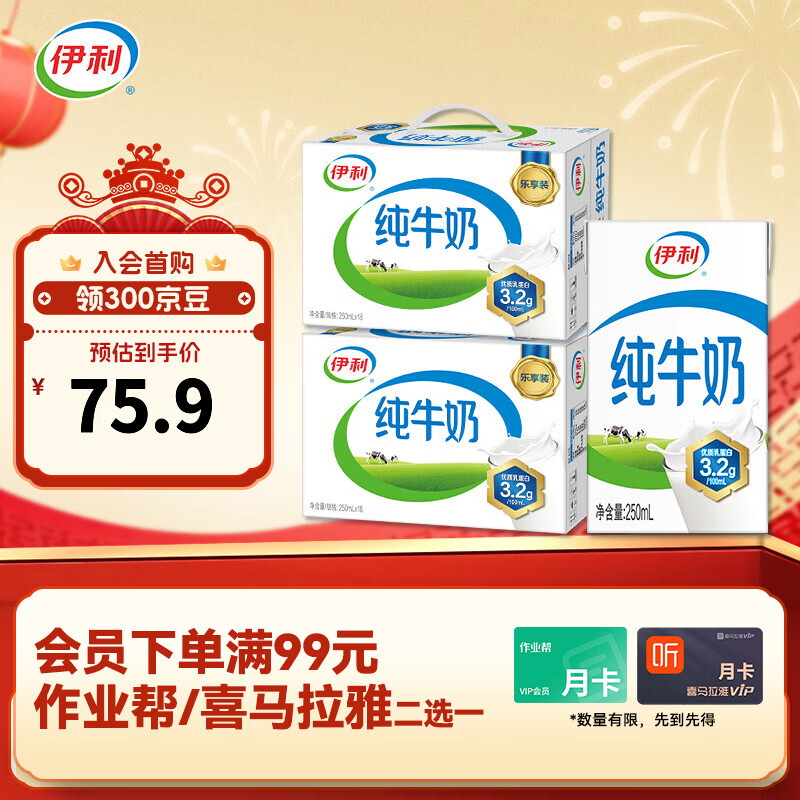 伊利纯牛奶250ml*18盒 优质乳蛋白 学生早餐 年货礼盒 10月产 纯牛奶250ml*18盒/箱*2箱