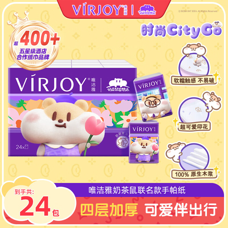 唯洁雅手帕纸 奶茶鼠印花无香 4层5张24包 湿水不破 纸巾小包 面巾纸