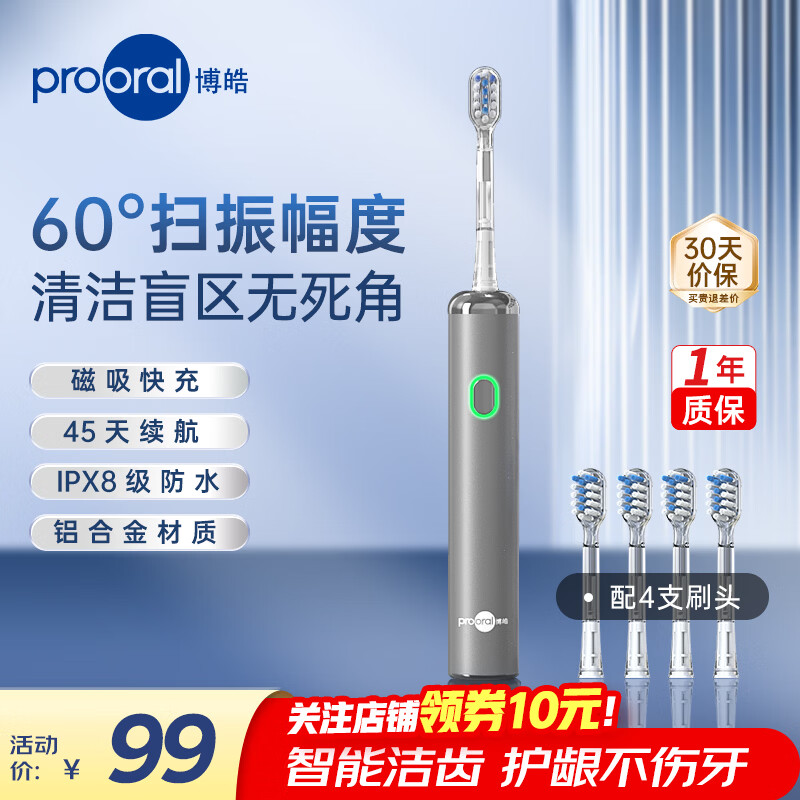 博皓(prooral)电动牙刷铝合金成人扫振自动牙刷磁吸充电情侣牙刷便携 智能牙刷软毛刷头 男女士专用 LS-1 银色