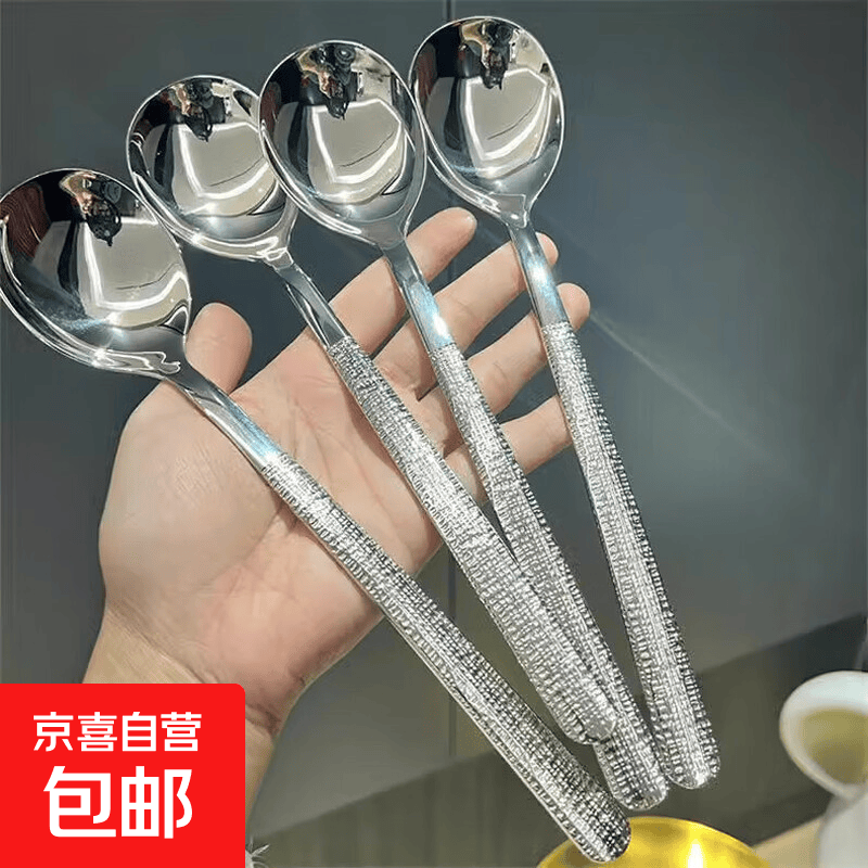 不锈钢勺子家用餐具汤吃饭喝锤纹西餐圆勺调羹主餐勺长柄汤匙 轻奢钻纹勺2支