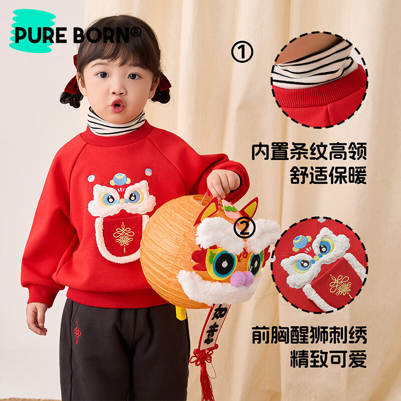 博睿恩(Pureborn)男女宝宝新年卫衣秋冬新款婴童加绒保暖醒狮女孩拜年服 爆竹红 120