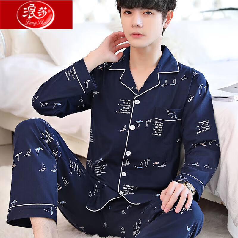 浪莎睡衣男春秋款纯棉长袖家居服男款秋冬薄款套装夏季短袖 【纯棉长袖+长裤】深蓝帆船 3XL 建议穿175-200斤