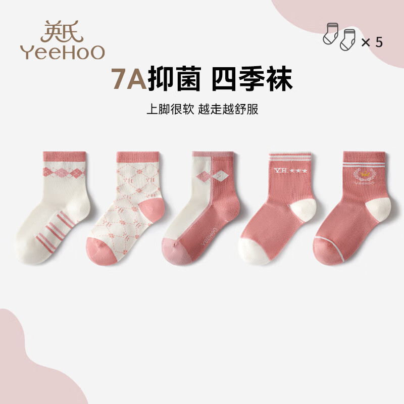 英氏5双装儿童袜子男童女童四季袜子春季新款宝宝袜透气棉袜耐穿 瑰粉学院款 【7A抗菌耐磨洗】 5双 9-12岁 【L】 (适合脚长20-22cm)