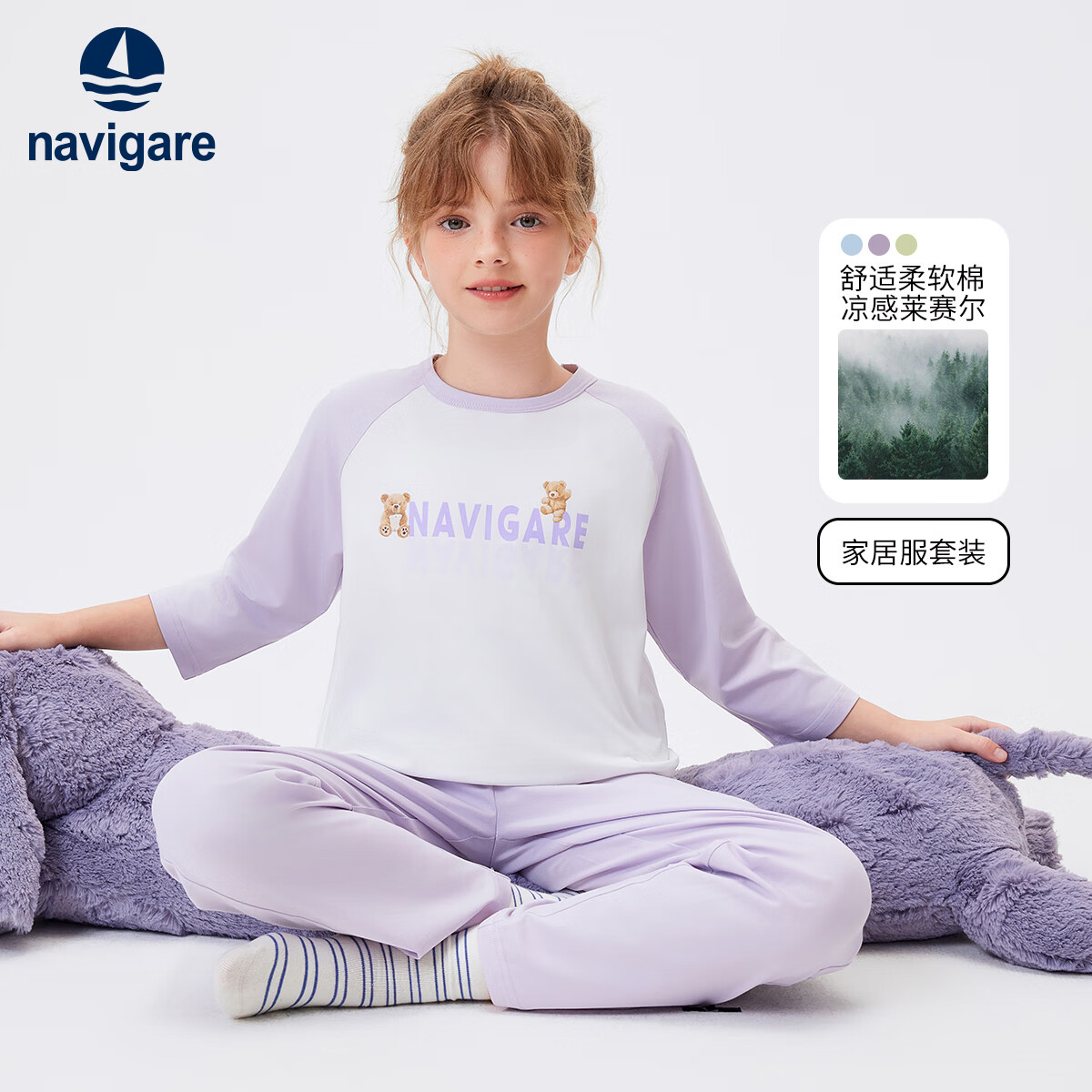 NAVIGARE意大利小帆船童装儿童家居服套装男童T恤套装女童两件套上下装 白兰紫 120