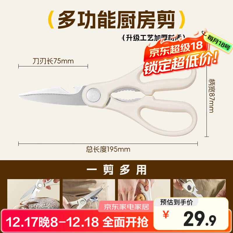 双枪不锈钢多功能厨房剪刀24年新款家用 剪鸡骨剪子食物剪夹核桃开瓶 【活动款】奶油白多功能剪刀