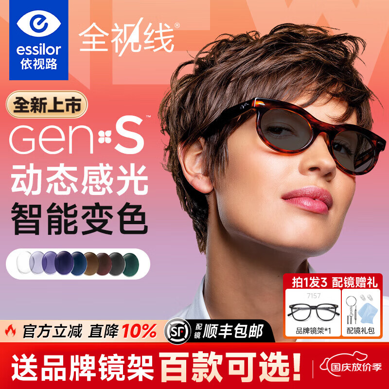 依视路全视线GEN S智能感光变色膜洁镜片1.56 1.67膜岩非球面耐磨近视镜 膜洁GEN S 变灰色【现片】+镜架 1.60(较薄)