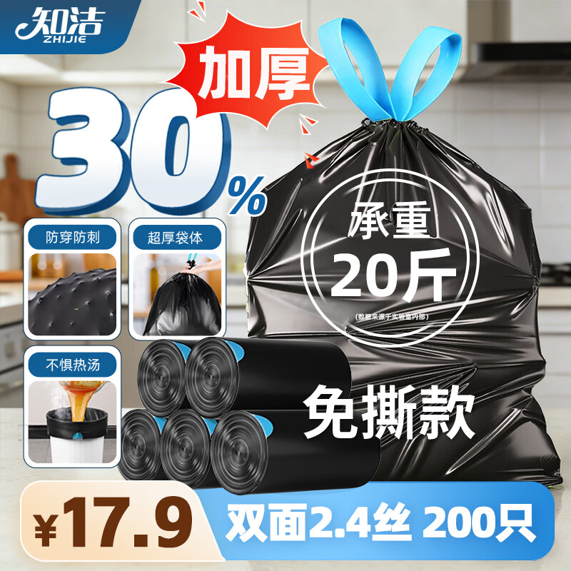 知洁抽绳垃圾袋黑蓝45*50cm200只单面1.2丝厨房家用手提穿绳免撕加厚
