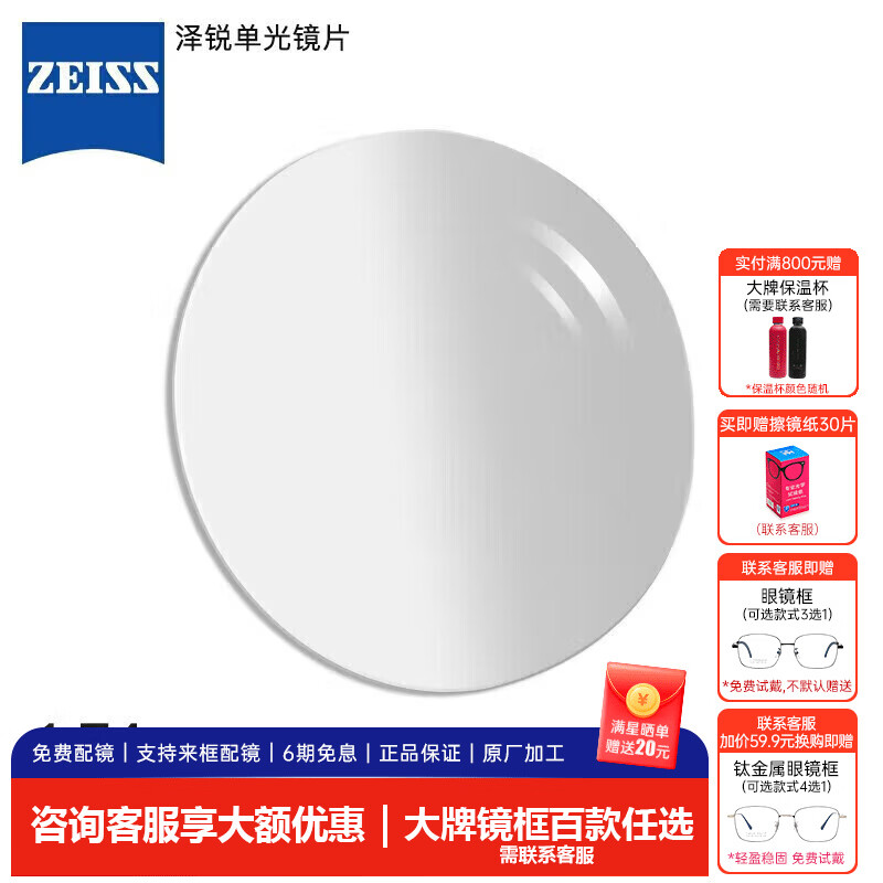 蔡司(ZEISS)泽锐眼镜片1.74自由环面防蓝光PLUS+钻立方铂金配镜定制1片
