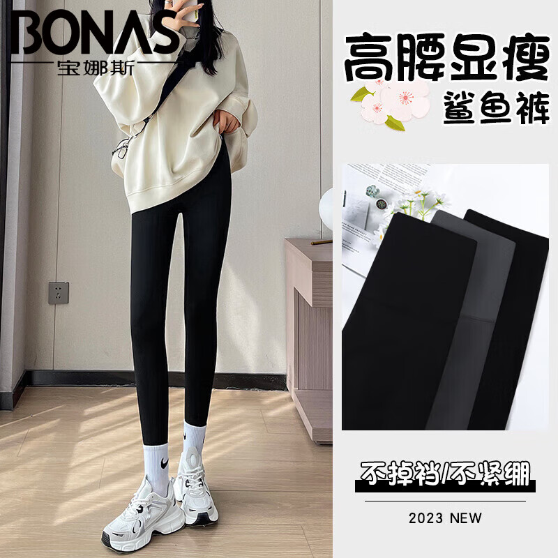 宝娜斯(BONAS)无痕鲨鱼裤女打底裤四季高腰可外穿高弹提臀骑行瑜伽裤 黑色-四季款 1条 M (适合80-105斤)