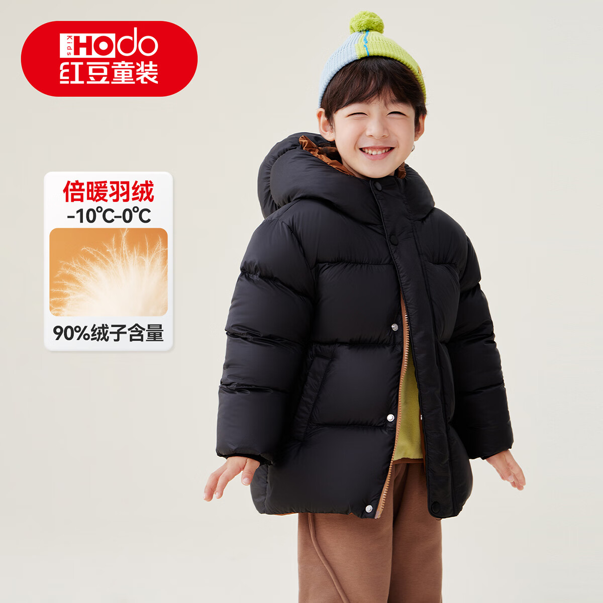 红豆童装简约女童90绒羽绒服儿童冬季新品男童加厚保暖连帽外套小童 黑色 120 充绒量82.9