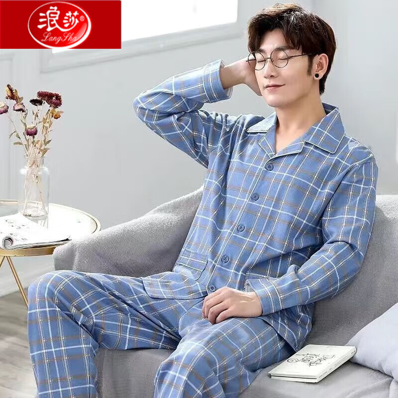 浪莎春秋季纯棉睡衣男士长袖全棉休闲大码肥佬宽松家居服套装 7722 3XL 适合180-200斤