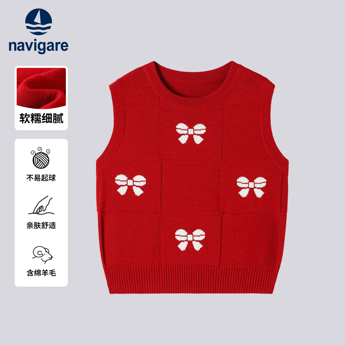NAVIGARE女童马甲秋季新款儿童背心毛衫圆领舒适叠穿甜美蝴蝶结 圆领蝴蝶结酒红 120