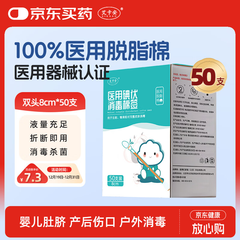 艾卡安医用碘伏棉签无菌碘酒消毒液棉签婴儿护脐带肚脐碘酊双头8cm*50支