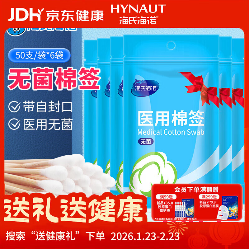 海氏海诺医用棉签 无菌消毒棉签棒 塑封口消毒护理成人婴儿单头竹棒大头
