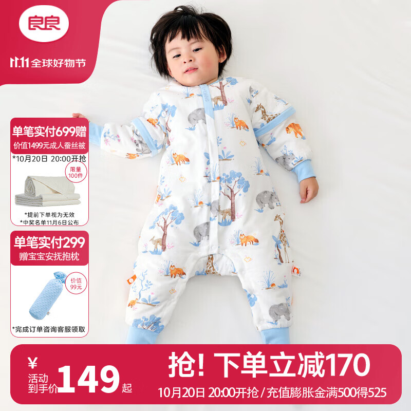 良良(liangliang)婴儿睡袋夏季空调房防踢被宝宝纯棉可拆袖儿童睡袋 雨林蓝·春秋款【适合20-25℃】 2XL(建议身高100-115cm)