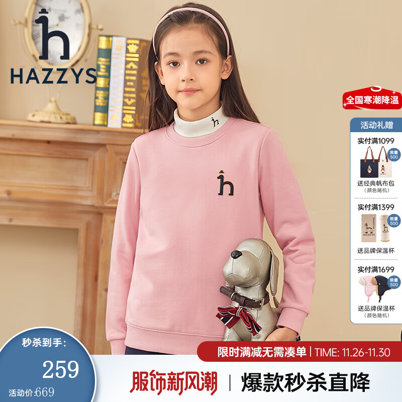 哈吉斯(HAZZYS)童装男女童卫衣秋季新品中大童圆领套头束口上衣 浅粉 165