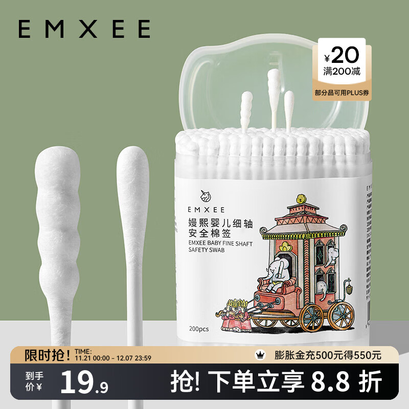 嫚熙(EMXEE)婴儿棉签新生儿耳鼻可用细螺旋头一次性宝宝清洁棉棒 200支/盒
