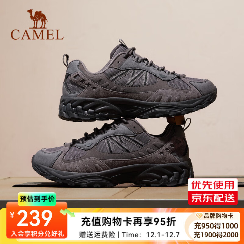 骆驼(CAMEL)漫野2代男鞋女鞋复古慢跑步厚底缓震休闲运动鞋子 4043,石板灰/黑,男 42