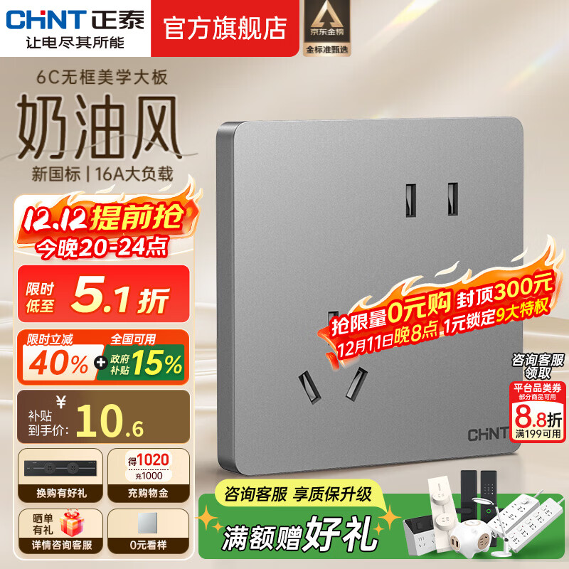 正泰(CHNT)开关插座6C 奶油风大板 家用86型带USB斜五孔暗装插座面板 幻银 斜五孔