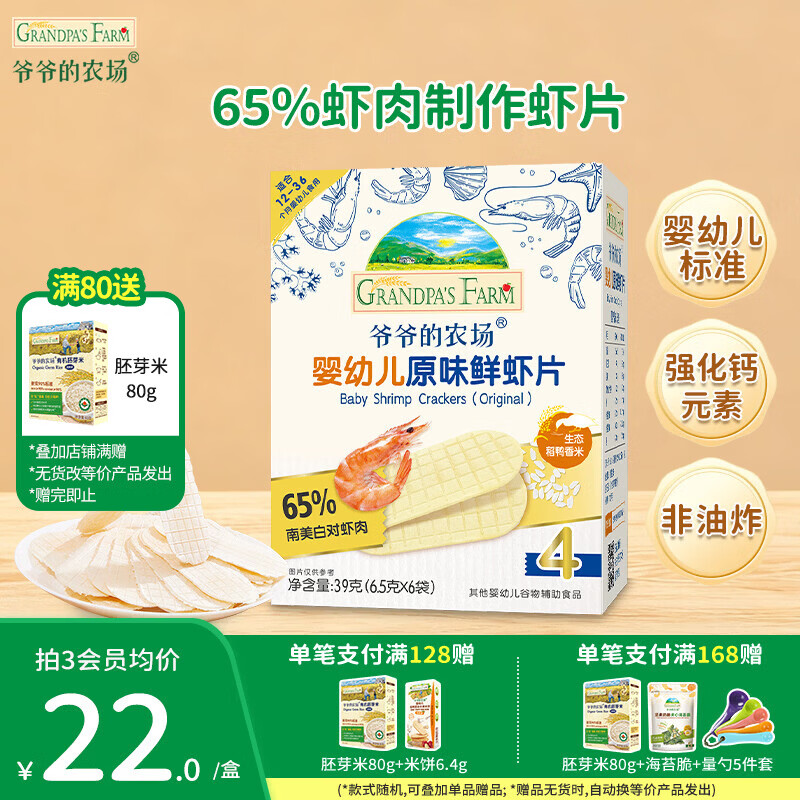 爷爷的农场儿童宝宝零食【99元任选5件】鳕鱼肠溶豆米饼干海苔脆磨牙棒虾片 【99元任选5件】原味鲜虾片39g