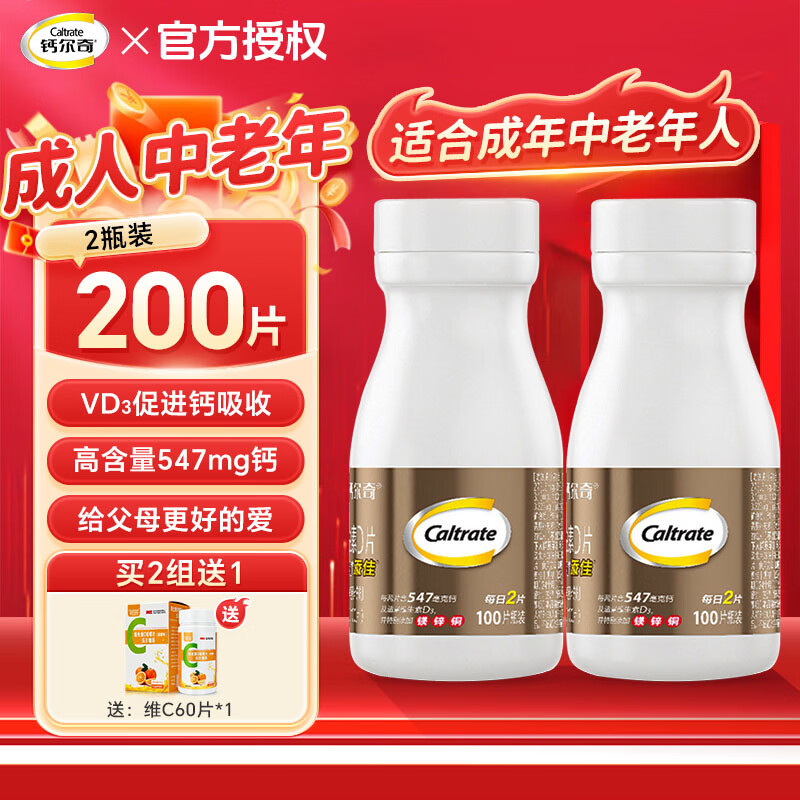 钙尔奇金钙尔奇钙片中老年补钙成人男女士维生素d3碳酸钙骨质疏松腿抽筋 100片*2瓶 装