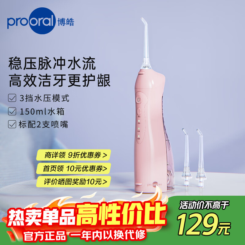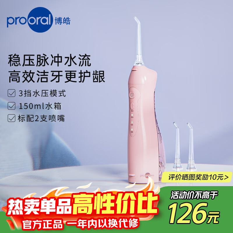 博皓(prooral)电动冲牙器便携式洗牙器牙齿冲洗器水牙线洁牙器牙缝清洁器剔牙神器牙垢去除工具正畸呵护手持立式 晨曦粉| 3种模式| 净护合一