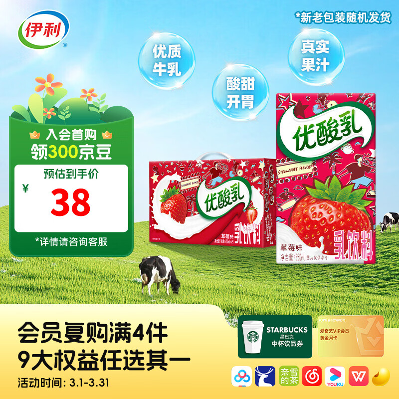 伊利优酸乳草莓味250ml*24盒/箱 风味乳饮料 营养早餐 年货礼盒 1月产