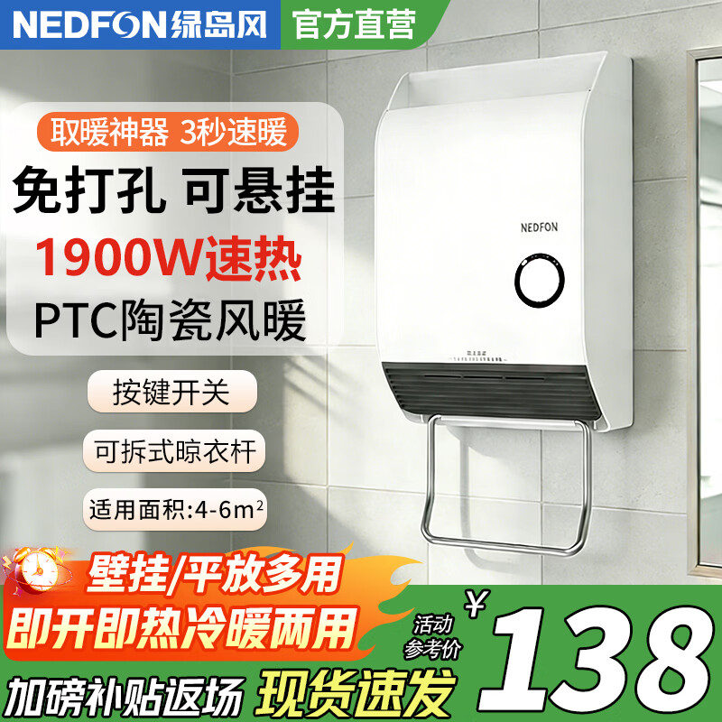 绿岛风(Nedfon)风暖浴霸卫生间壁挂暖风机浴室取暖器挂式办公室取暖神器免打孔 FQ21A(旋转开关款)