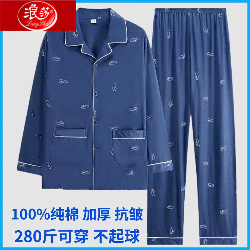 浪莎男士睡衣男纯棉加肥加大码春秋长袖青中老年开衫两件套装 930 3XL 建议165-200斤