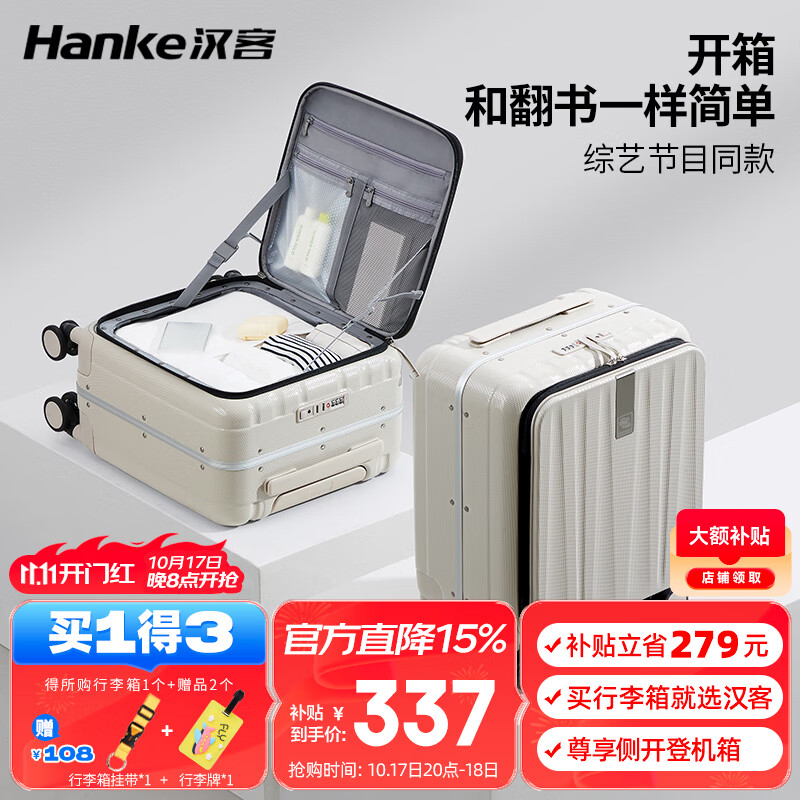 汉客行李箱男拉杆箱女登机旅行箱14英寸象牙白密码箱镇店前侧开盖铝框