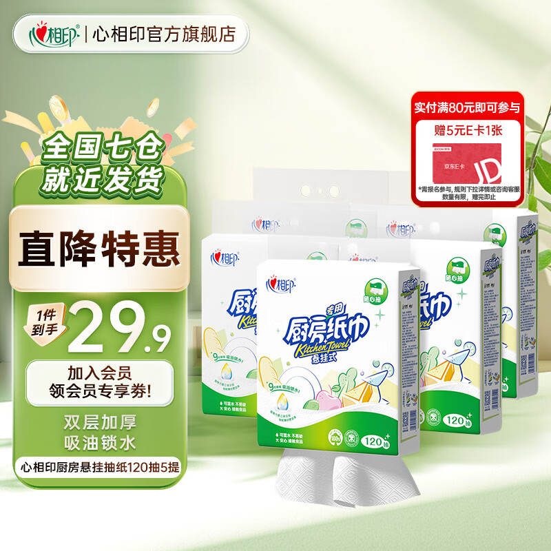 心相印厨房纸巾悬挂式抽纸提装擦手一次性方便吸油吸水去油污 【9倍吸油锁水】 2层 120抽*5提